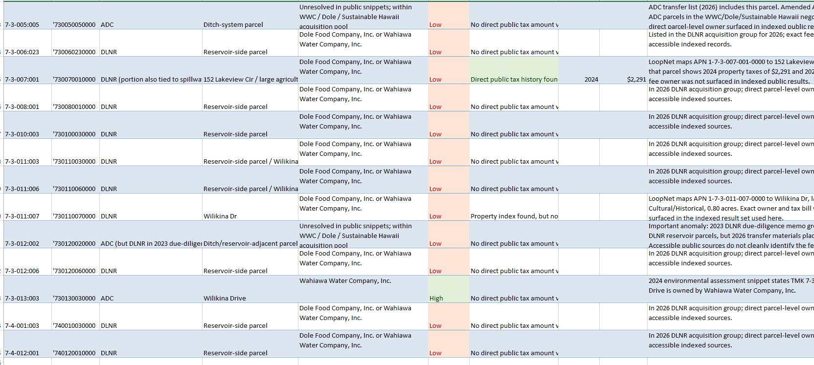 Executive take: the public record does not show a simple one-owner Lake Wilson structure. Instead it points to a split system in which Dole-related entities, Wahiawā Water Company, and Sustainable Hawaii appear across different parcels and roles, while the State has been trying to assemble the whole package through Act 218. That fragmentation is the main reason the situation feels opaque—control, liability, and tax treatment do not sit neatly in one place.