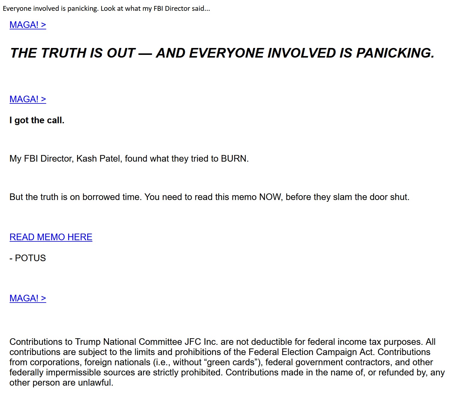 Repetition & micro-conversions | Multiple “MAGA! >” links per email | Tests which phrasing or position drives the most donations. |
