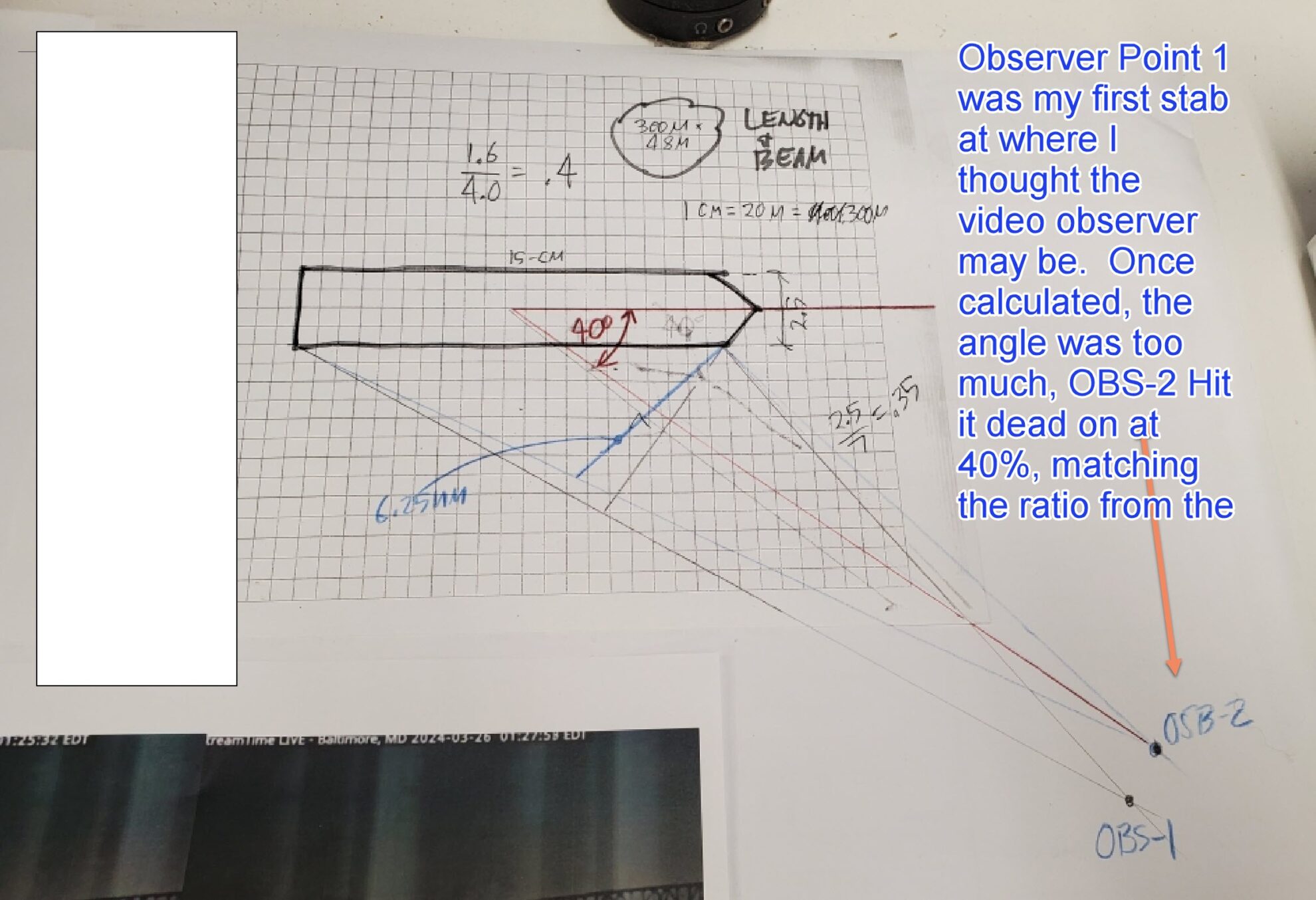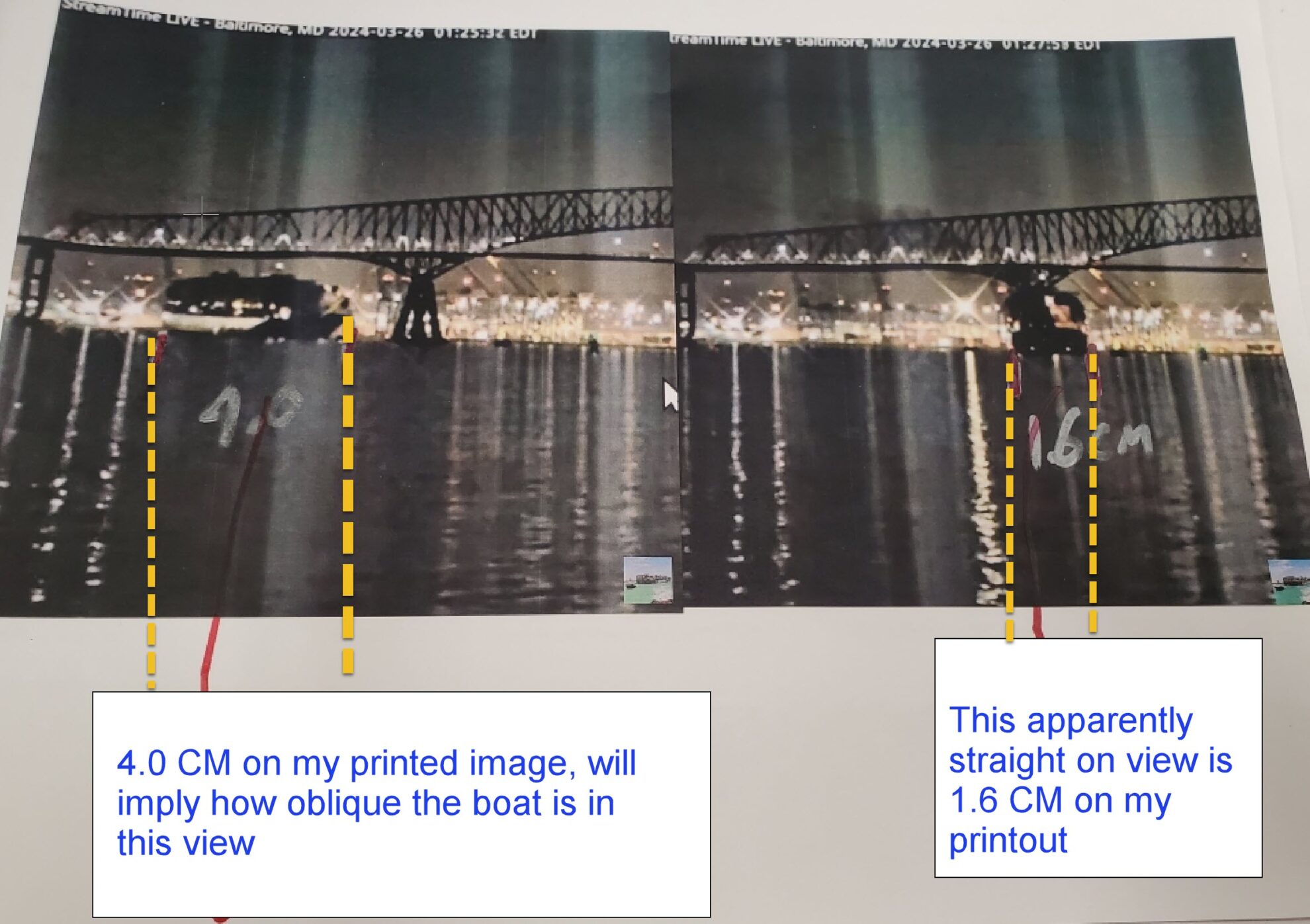 Not sure if I sent these, but using the actual boat dimension, and the straight on and oblique view, I calculate the ship made a 40 degree turn in a very short amount of time, although video may be sped up in parts.