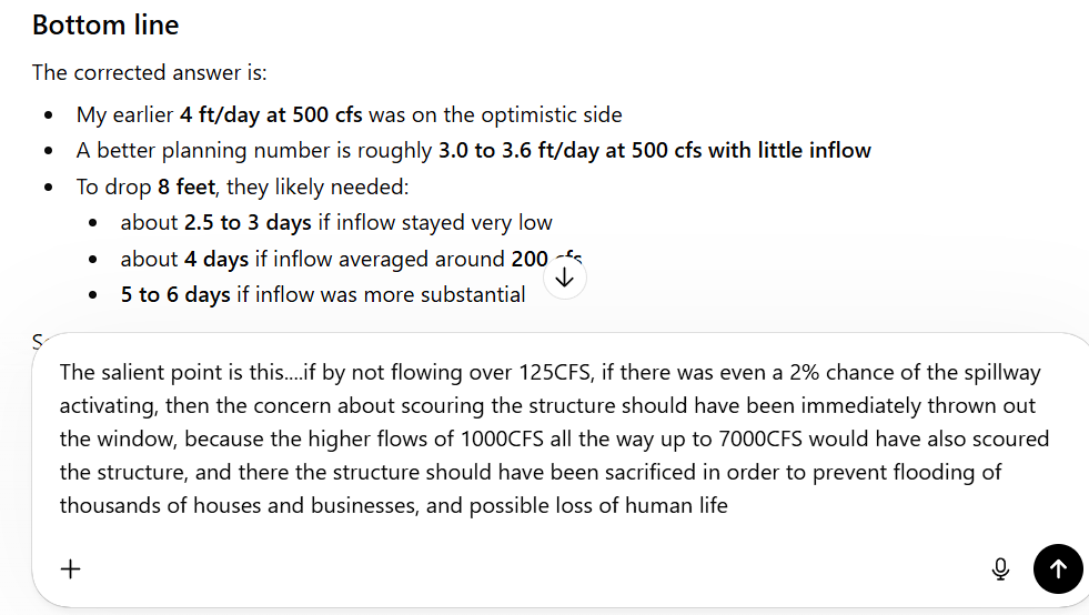 That would have put a heavy load on the river, 500 CFS. But they only ran it at 125 CFS, causing the spillway to be forced into action. At peak level of 85.3 the flow rate over the spillway was around 7000 CFS. So was the structure scoured and toppled? The flooded thousands of homes and land in order to protect this structure?