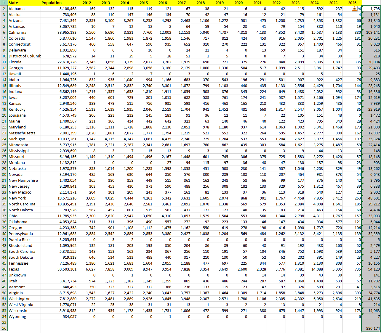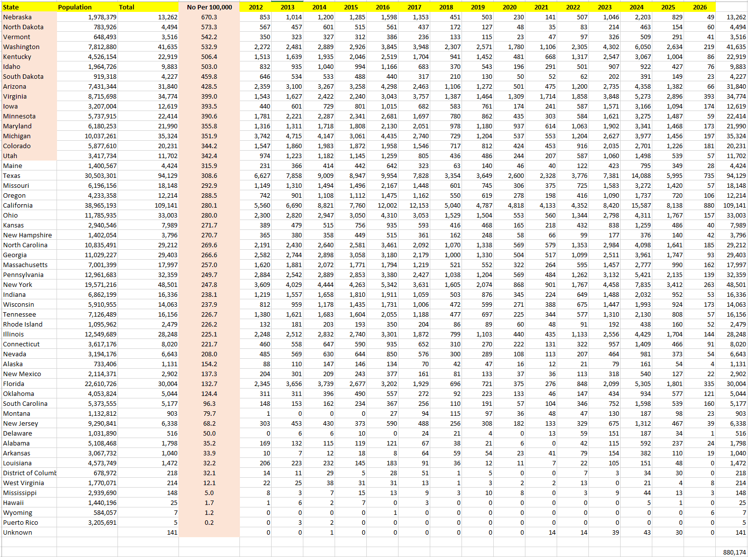 stock here: this site presents some data. I created a pivot table, seperated by state and year. But the BOOM!! Is that this represents ONLY 880,000 of the invaders. See second from bottom. Then at bottom I sorted by most “Legal Invaders” per 100,000, and the top ones are “Nice States” or Shaky States that they need more control of.