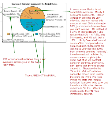 In some areas, Radon is not completely avoidable. Mostly it seeps into basements. Radon ventilation systems are very effective, they can reduce this amount at least 50% and maybe 80%, just depends how much air you want to move. So instead of a 37% of your exposure if you reduce that 80% it is 7.5%, plus 5% cosmic, and 3% soil, that is 15%. So by "so called 'natural sources" like med procedures, nuke medicine, those items are jacking up your dose like 400% to 700% from where is could be "naturally". the whole natural radiation lie, unravels as a complete joke... about half of us will contract cancer in our lives, and yet you can't prove that any one source caused it. Therefore by the "Scientific Method" radiation cannot be proven to be unsafe, therefore the PNPs Pro Nuke Pimps will state that "natural radiation" is proven to be safe, and therefore a little extra disaster radiation is OK too. Check the chart closely, the PNP lies immediately emerge.